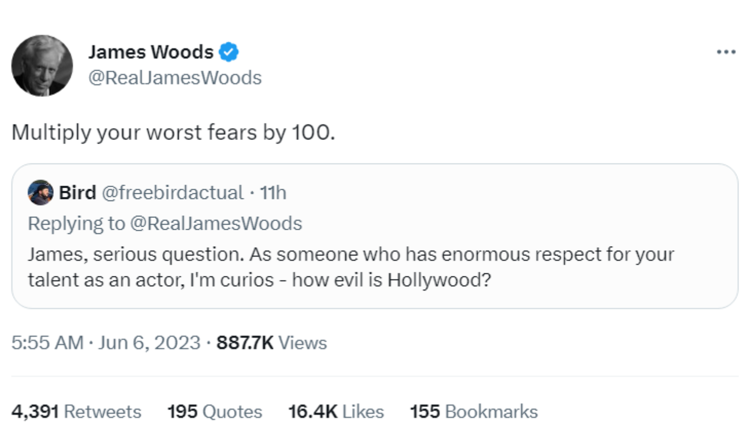 “James, serious question. As someone who has enormous respect for your talent as an actor, I’m curious – how evil is Hollywood?” asked the user.