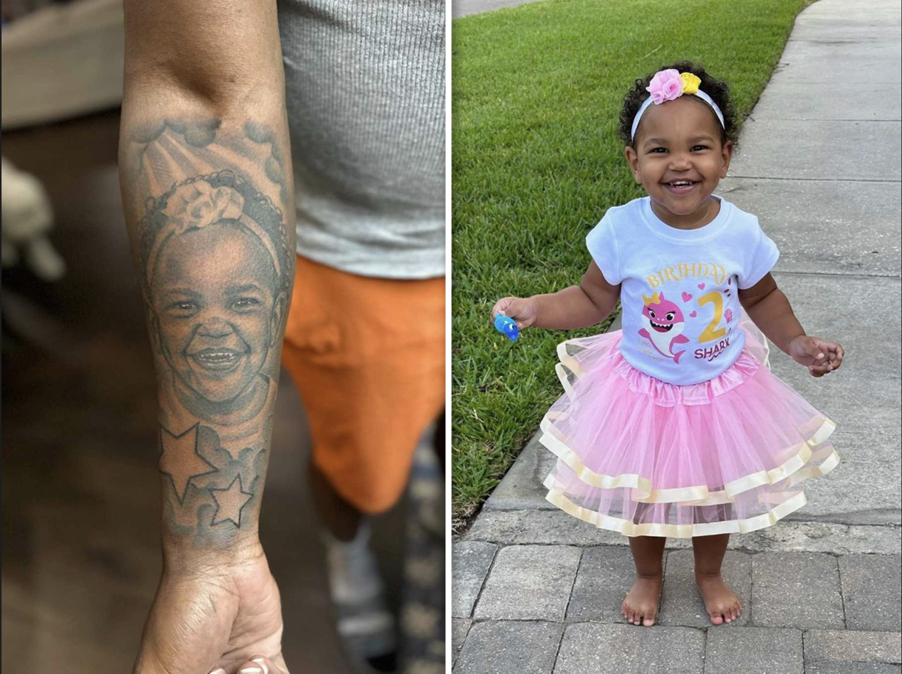 The tattoo intricately showcases an image of the precious girl captured during her second birthday celebration. Additionally, it incorporates celestial elements, including stars and a radiant beam of light piercing through clouds, symbolizing hope and transcendence.